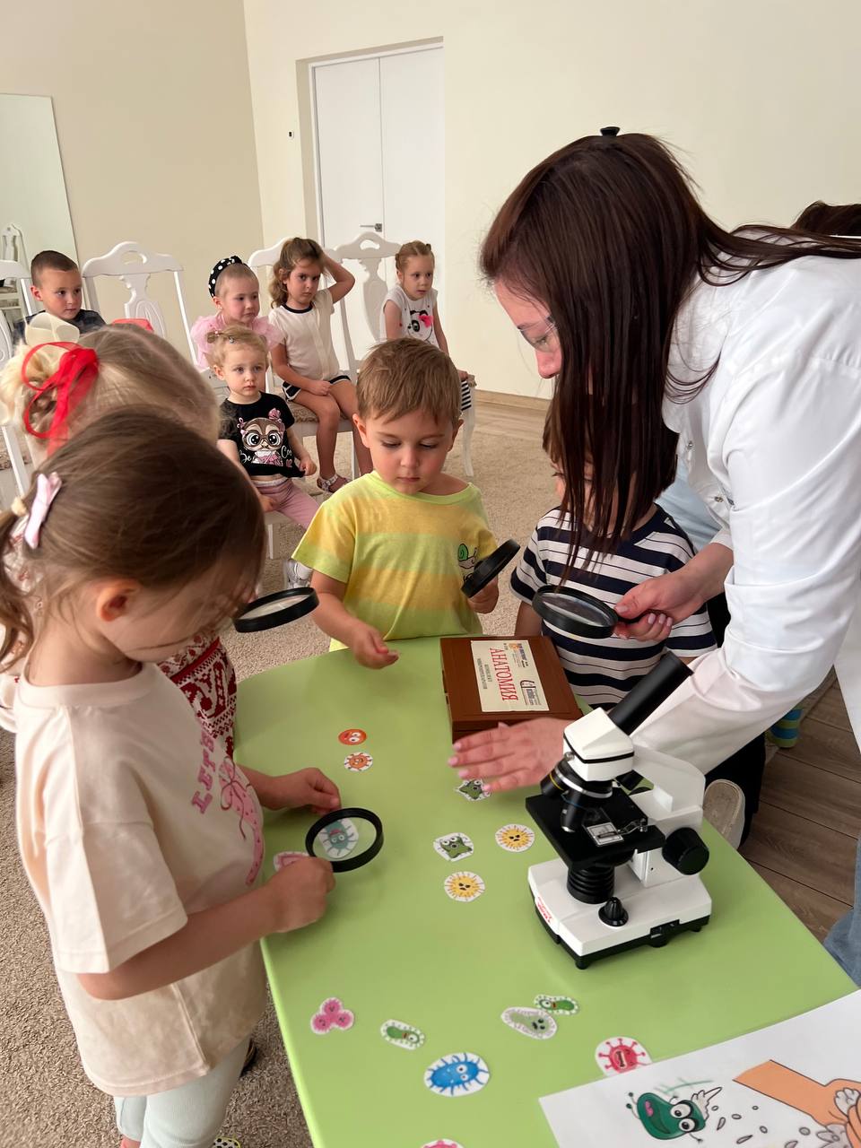 Ребята знакомились с микроскопом и впервые увидели клетки растений, рассматривали микробы через лупу и обсуждали, как важно заботиться о здоровье.
