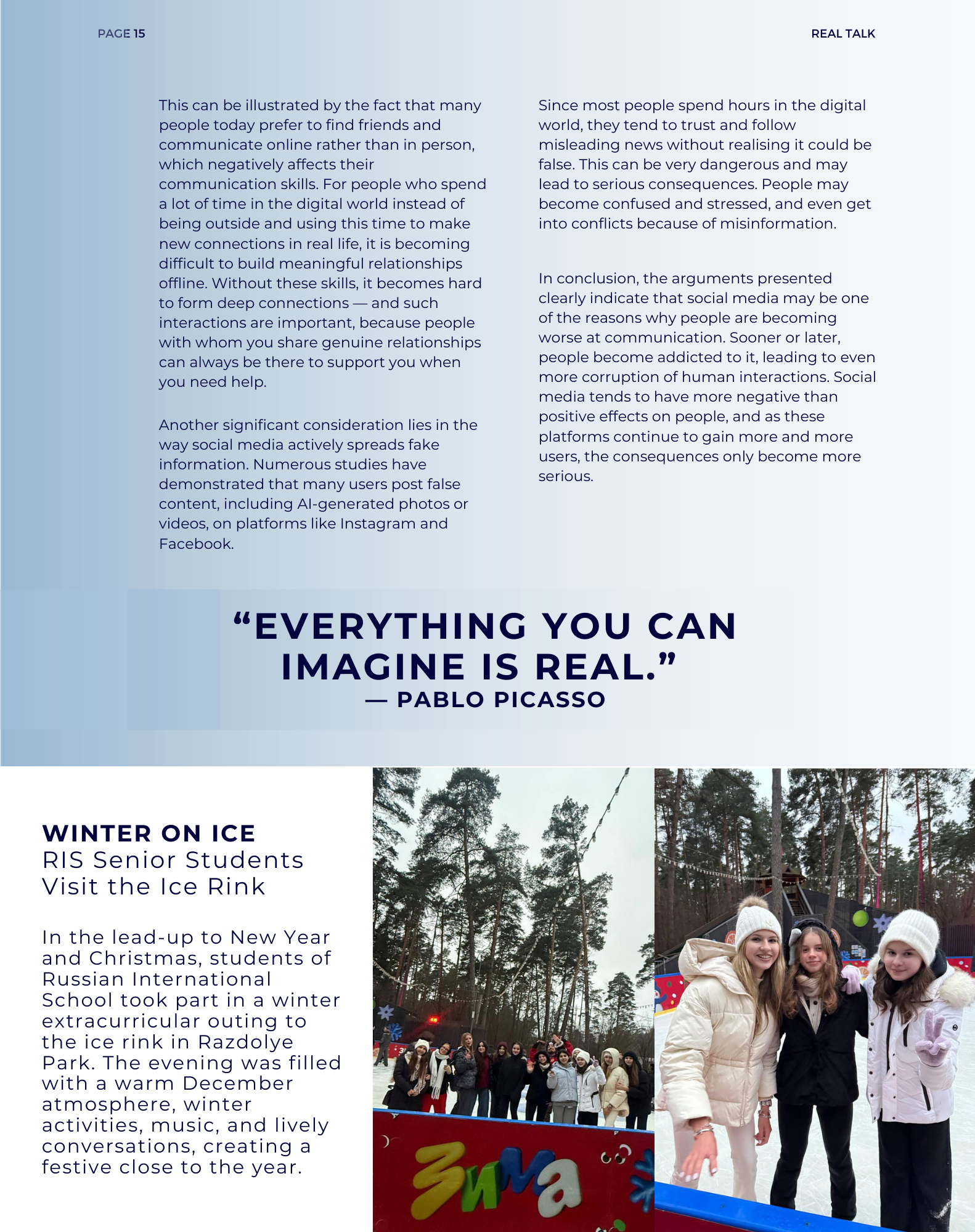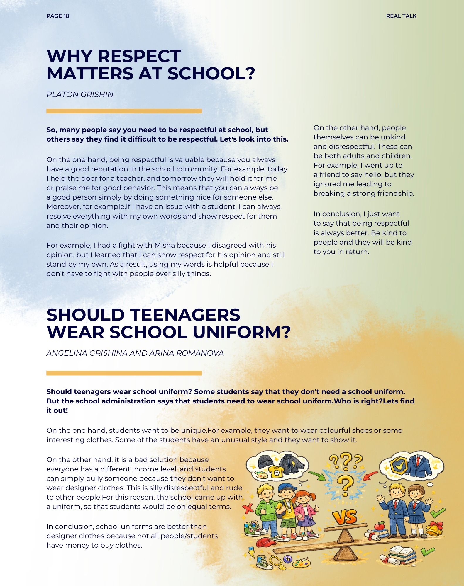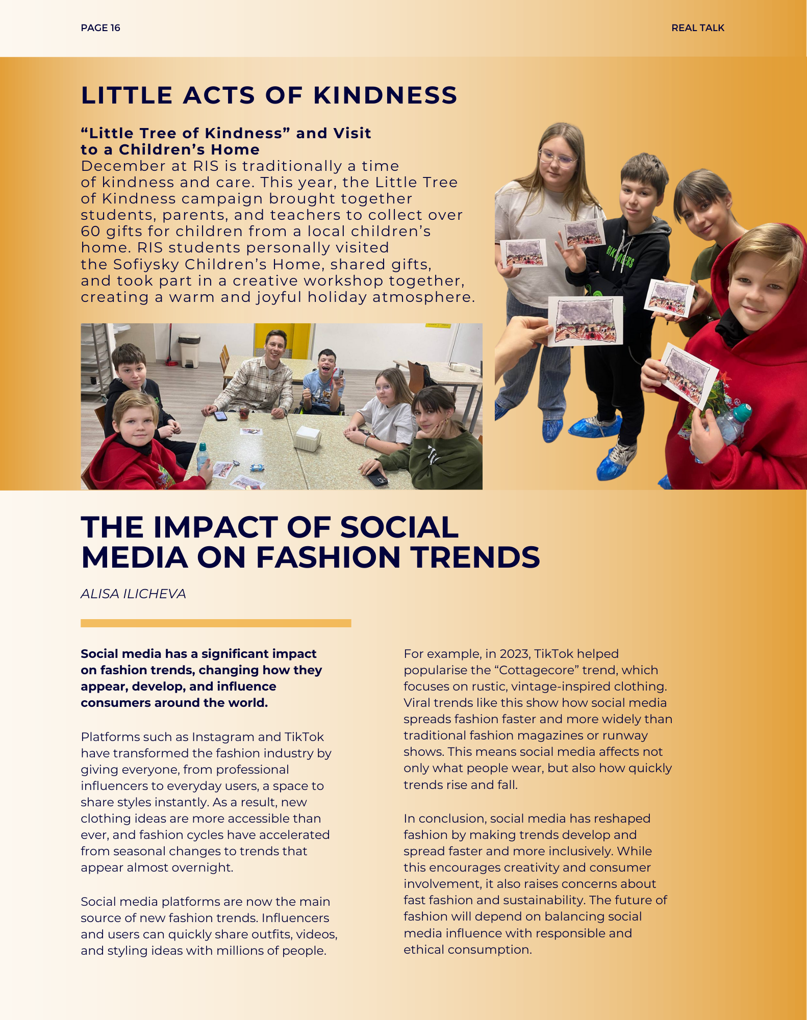 Школьная газета RIS является важной частью образовательной среды. Она даёт ученикам возможность развивать письменную речь, критическое мышление и навыки самостоятельного анализа, а также делиться своим взглядом на мир за пределами учебной программы.
